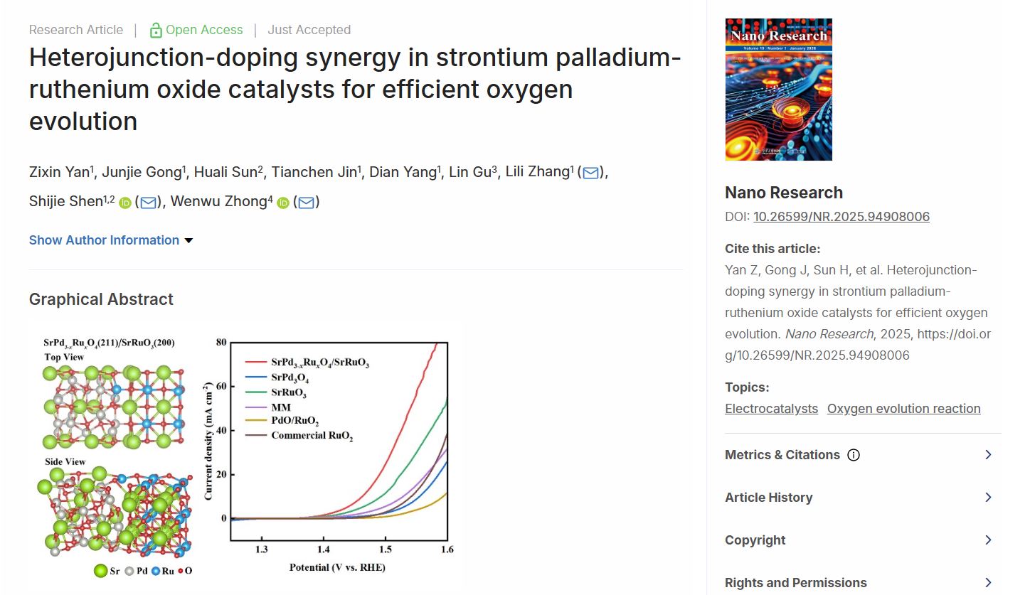 钟文武教授团队在电催化析氧反应领域取得突破性进展,相关成果以“异质结与掺杂协同效应显著提升钯基析氧催化剂性能”为题,发表于国际知名期刊《Nano Research》,为电解水制氢规模化应用提供关键技术支撑。