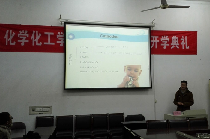 随后,学术交流会按计划进行。第一环节是学术分享环节,第一位做汇报介绍的是2014级研究生杨超凡,他以《关于锂离子电池正极材料的实验进展》为题,为大家简述了锂离子电池的研究。他认为目前锂离子电池研究重点在于寻找具有高比容量、高循环稳定性的正极材料,而这个过程不能通过单独某一方面来提高,需要从正负极材料、电解液、隔膜等多方面来总体考虑。随后通过PPT演示,详细阐述制备和实验过程。在介绍的末尾,杨超凡同学也提出了关于材料的制备方法、性能测试以及电解液的有机添加剂三个方面的问题,与在场的老师和同学进行了讨论。