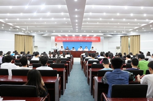 在图书馆一楼报告厅举行第六届大学生科技文化月开幕式暨2015届毕业生考研表彰大会,校学工部、团委负责人和学院党政领导班子参加了此次开幕式,由学院党委副书记徐青主持。