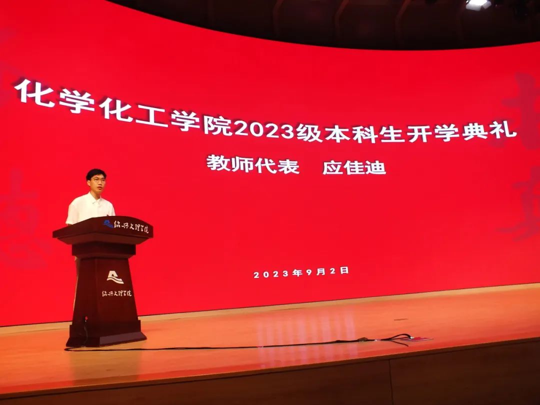 教师应佳迪、应用化学201班李婷菲、化学师范232班赵舒怡分别代表全体教师、老生、新生发言,对全体新同学表示欢迎,同时勉励大家脚踏实地,不负韶华,为学校、学院的建设发展谱写新篇章。