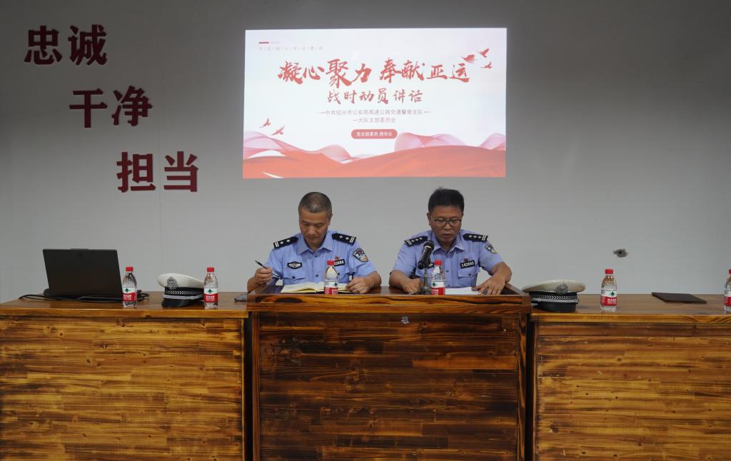 一大队党支部委员、副大队长周华云作亚运战时动员讲话,他指出,在距离杭州亚运会开幕仅10天的关键时刻,绍兴交通护航任务艰巨,全体警员要时刻保持清醒的头脑,以高度的责任心肩负起亚运会安全保障工作,为全力护航亚运会奋战前行。