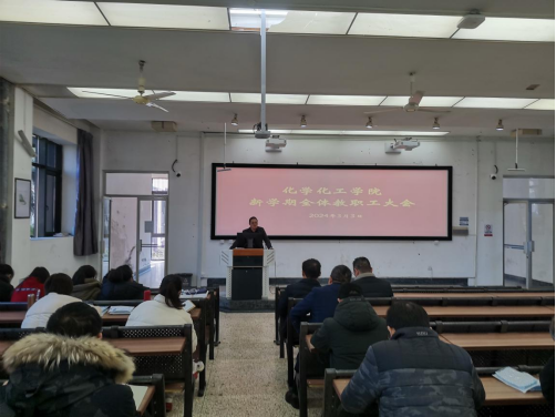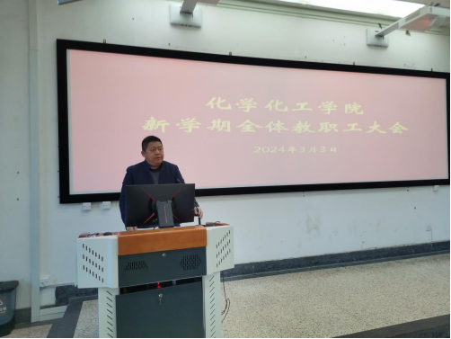 执行院长曾敏峰通报了学院寒假期间主要工作,向寒假期间积极完成材料与化工、生物医药2个专业硕士点申报的专班工作人员表示了感谢,也对放弃休息时间积极申报国家自然科学基金项目的老师表示了肯定。他表示,学院在开学伊始召开教职工大会,主要明确新形势、知晓新要求、确立新目标、争取新成绩。他从加强一流学科建设、高水平人才队伍建设、高水平科研成果培育、提升人才培养质量、深化地方服务等方面回顾学院2023年取得的主要工作,同时提出2024年学院工作思路、主要目标、重点任务,勉励大家振奋精神、开拓创新、拼搏奉献,在高质量推进化学一级学科博士学位授权点创建立项建设,材料与化工、生物医药两个专业硕士点申报,人才培养、学科建设与地方服务,努力推动学院高质量突破性发展等方面做出积极贡献。