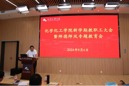 在风则江大讲堂107报告厅召开新学期全体教职工大会暨师德师风专题教育会,传达学校暑期干部读书会精神,全面部署学院新学期工作,学院党政领导班子成员及全体教职工参加了会议,会议由党委书记徐青主持。