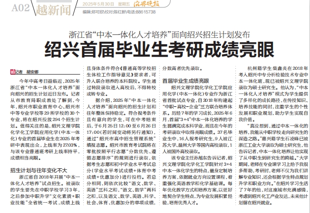 绍兴晚报5月30日:浙江省“中本一体化人才培养”面向绍兴招生计划发布 绍兴首届毕业生考研成绩亮眼
